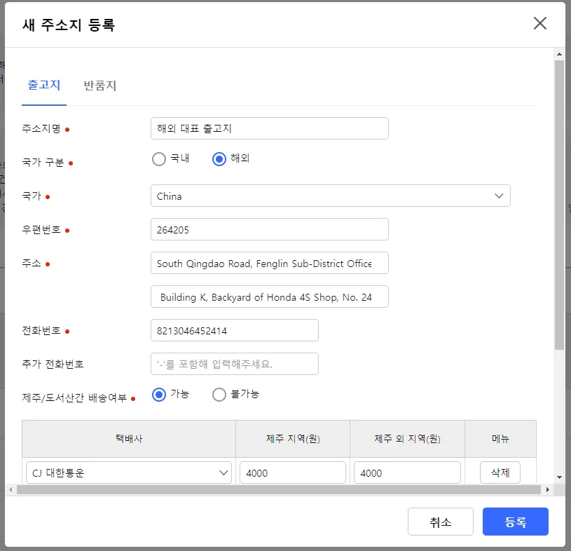 해외구매대행은 계약 택배가 없으니 택배사 계약 여부 없음에 체크 후 등록 해주세요.