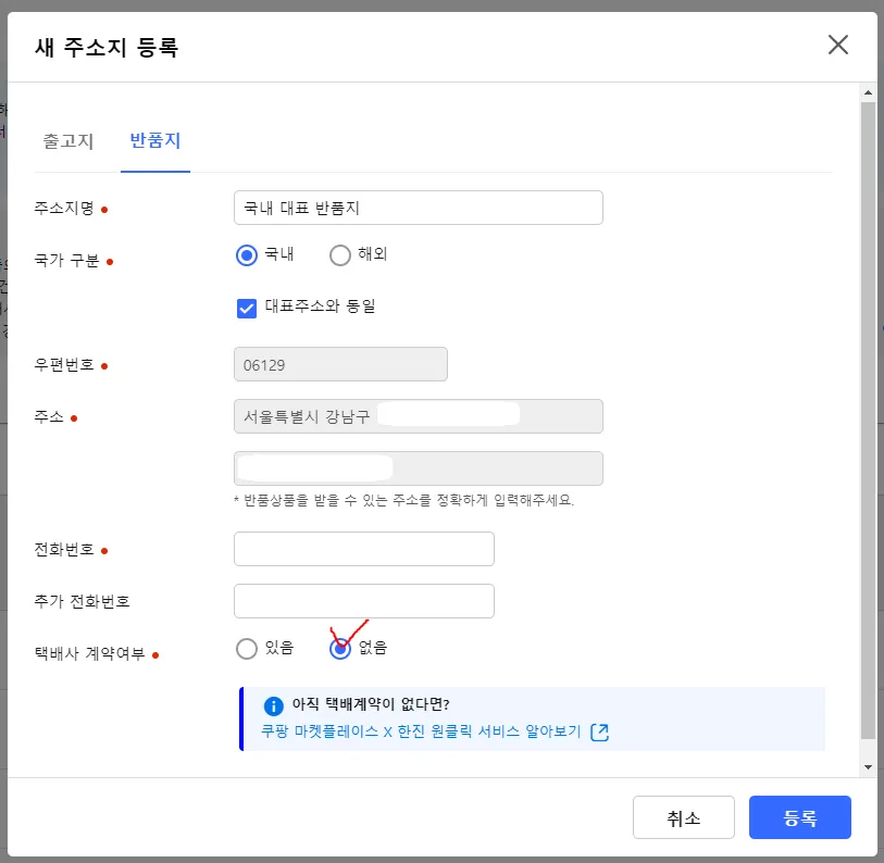 출고지를 등록 완료 했으면, 바로 옆에 반품지를 클릭 해주세요