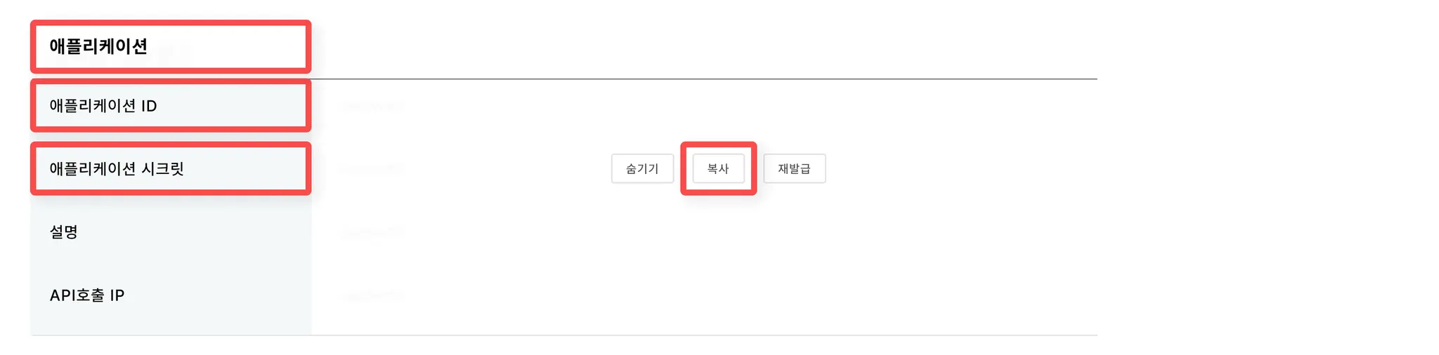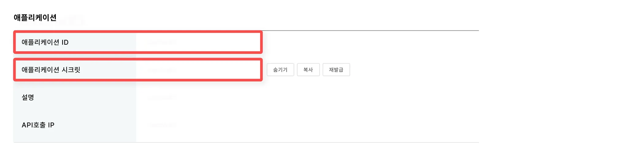 ‘애플리케이션 ID’ 와 ‘애플리케이션 시크릿’ 키값을 복사해주세요.