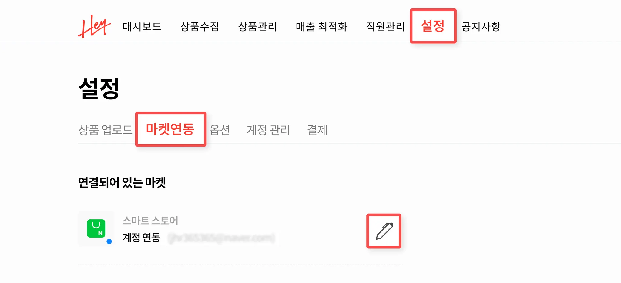 헤이셀러 설정 → 마켓연동 → 스마트스토어 왼쪽 연필모양 눌러주세요.
