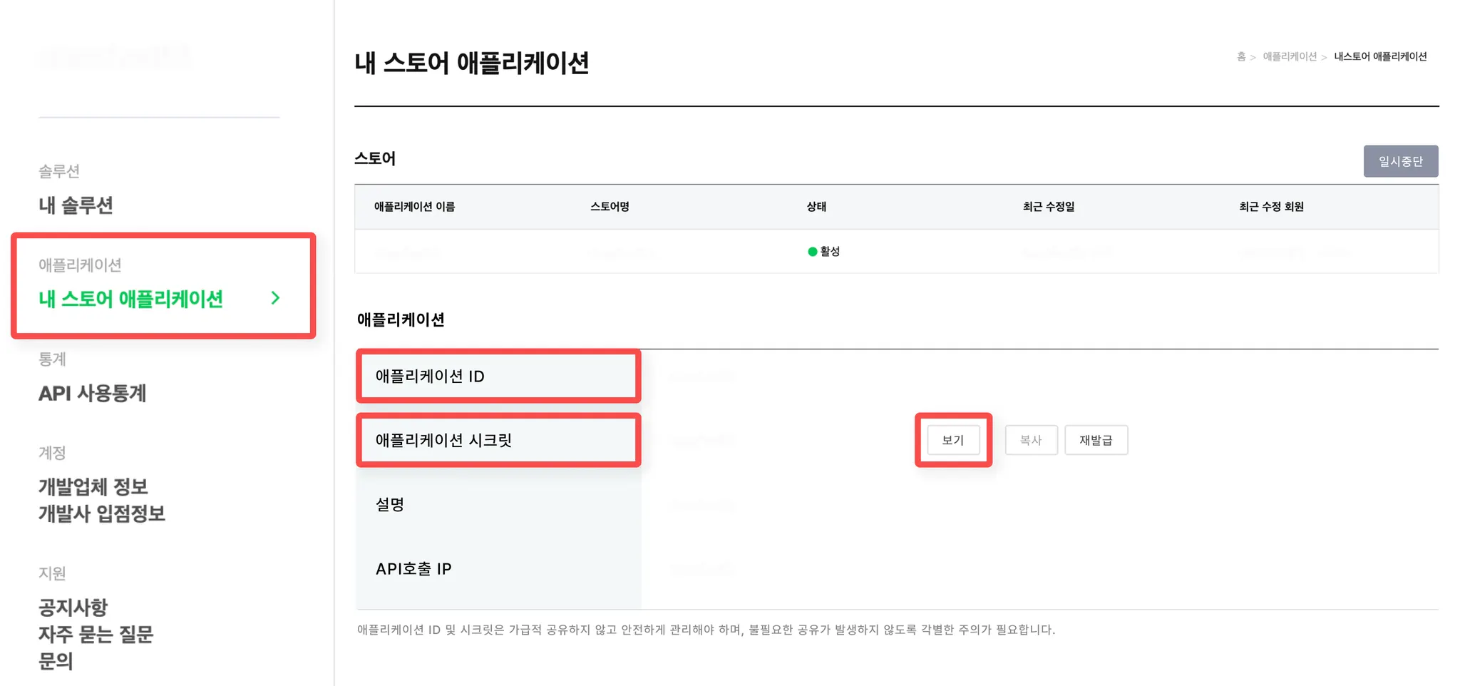 이제 마지막으로 ‘애플리케이션 ID’ 와 ‘애플리케이션 시크릿’ 키값을 아래 4단계. 헤이셀러 스마트스토어 API 방식 연동 방법에 따라 설정하시면 끝~!!!