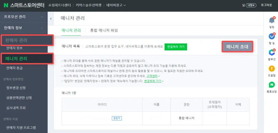 좌측 메뉴바에서 ‘판매자정보’ → ‘매니저 관리’ 에 들어가주세요.