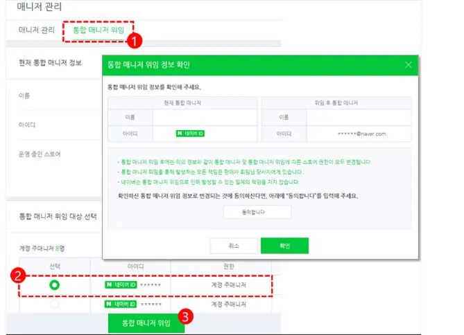 판매자정보 > 매니저관리 >통합 매니저 위임