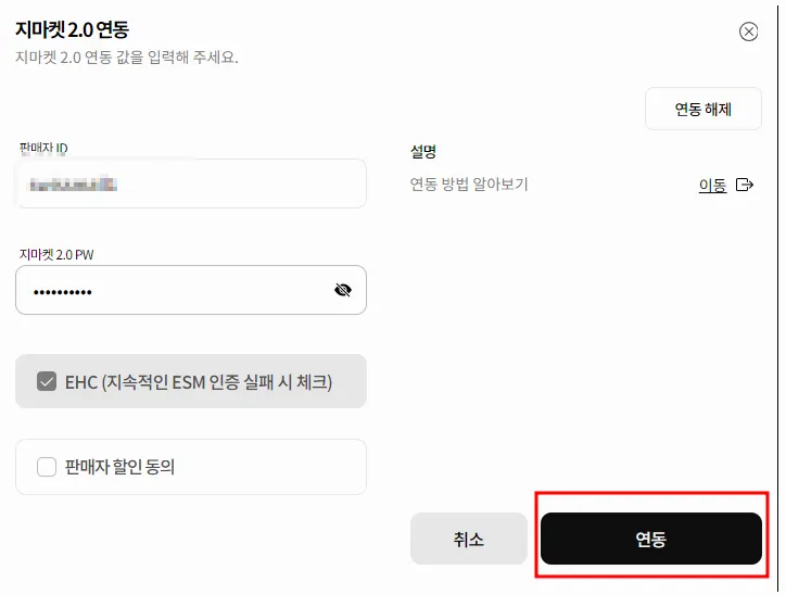 (Gmarket/AUCTION 각각 로그인 가능한 정보로 연동 가능합니다.)