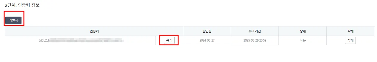 5.인증키 정보에서 키발급 클릭 후 생성된 키값 복사 하신 뒤