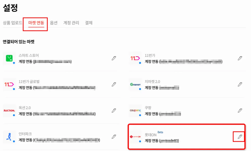 6.헤이셀러 → 설정 → 마켓연동 롯데온 오른쪽 옆 연필모양 누른 뒤 복사 한 OPEN API KEY 값을입력 후 연동하기 누르시면 됩니다.