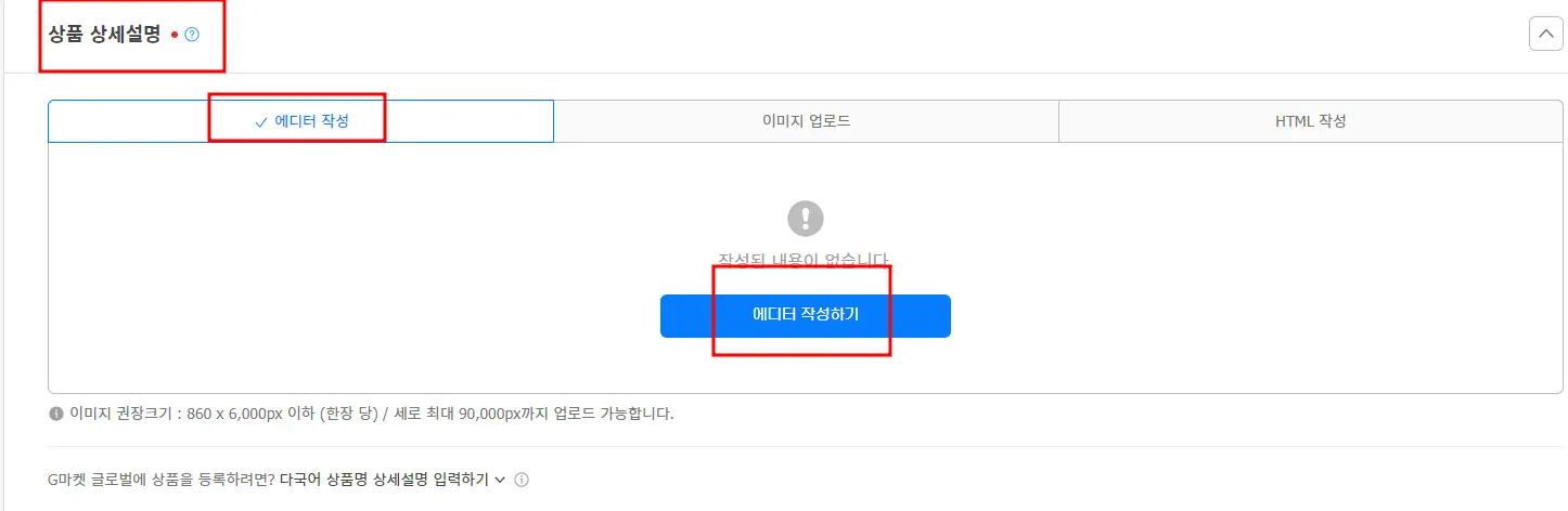 11.그 후 바로 아래에 상품상세설명 에서 에디터작성하기를 눌러주시고