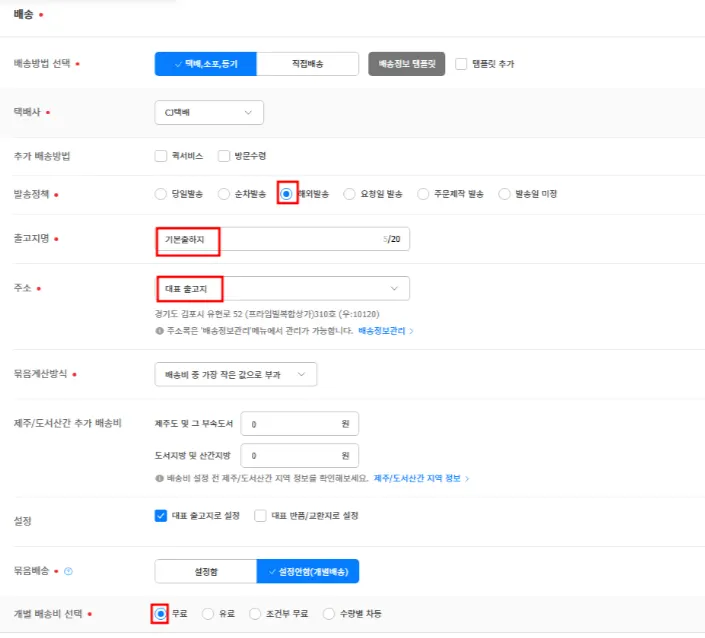 출고지:기본출하지(상단에 추가한 출고지가 나와야합니다.)