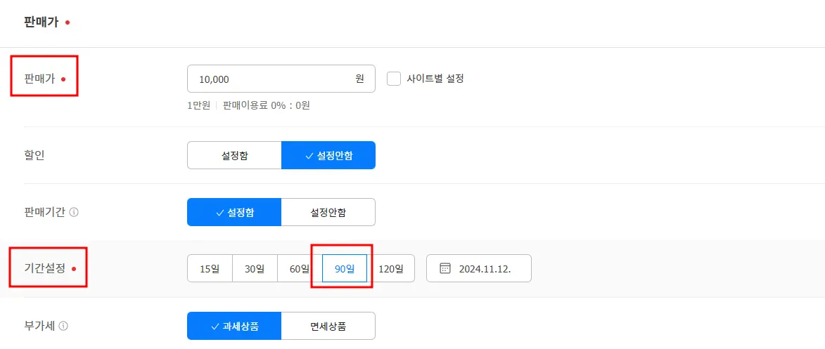 8.그 다음, 바로 아래 판매가 부분에 10,000원 써주시고 사진과 같이 설정하시면 됩니다.