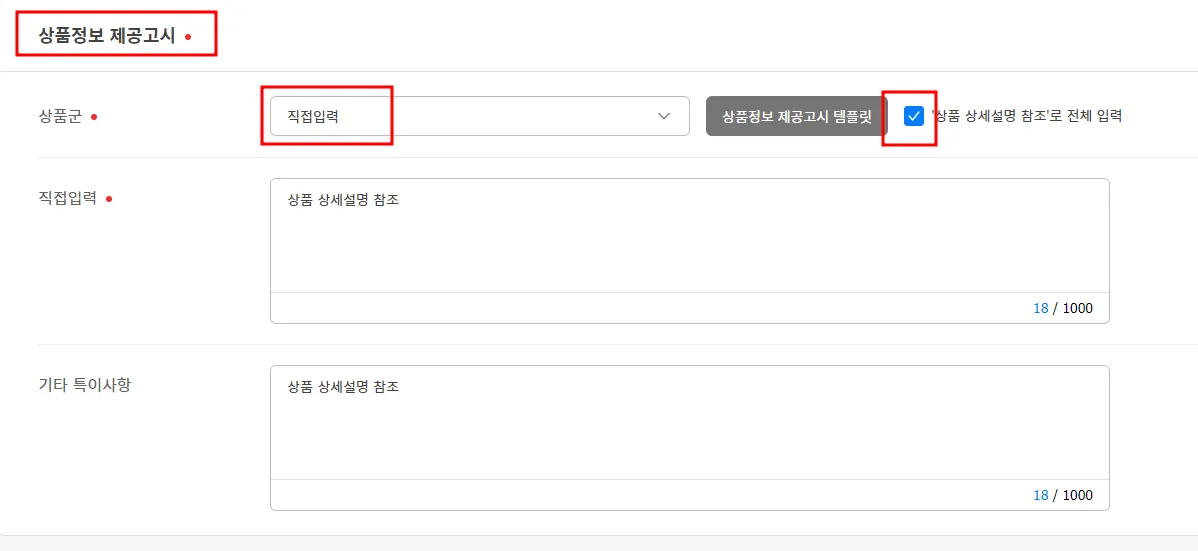 상품정보 제공고시는 직접입력 후 오른쪽 체크 하시면됩니다.