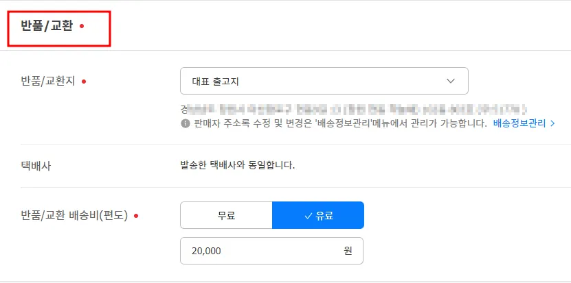 반품/교환지는 대표 출고지로 선택 후 반품/교환배송비는 20,000원으로 기재 후 등록하기 누르면 완료입니다!