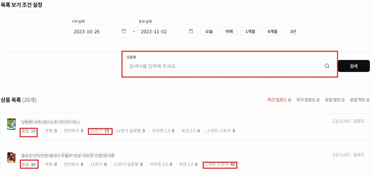 목록 보기 조건 설정에서는 날짜 지정 후 검색하시면, 해당 기간동안 유입이 있는 상품 목록을 확인하실 수 있습니다.