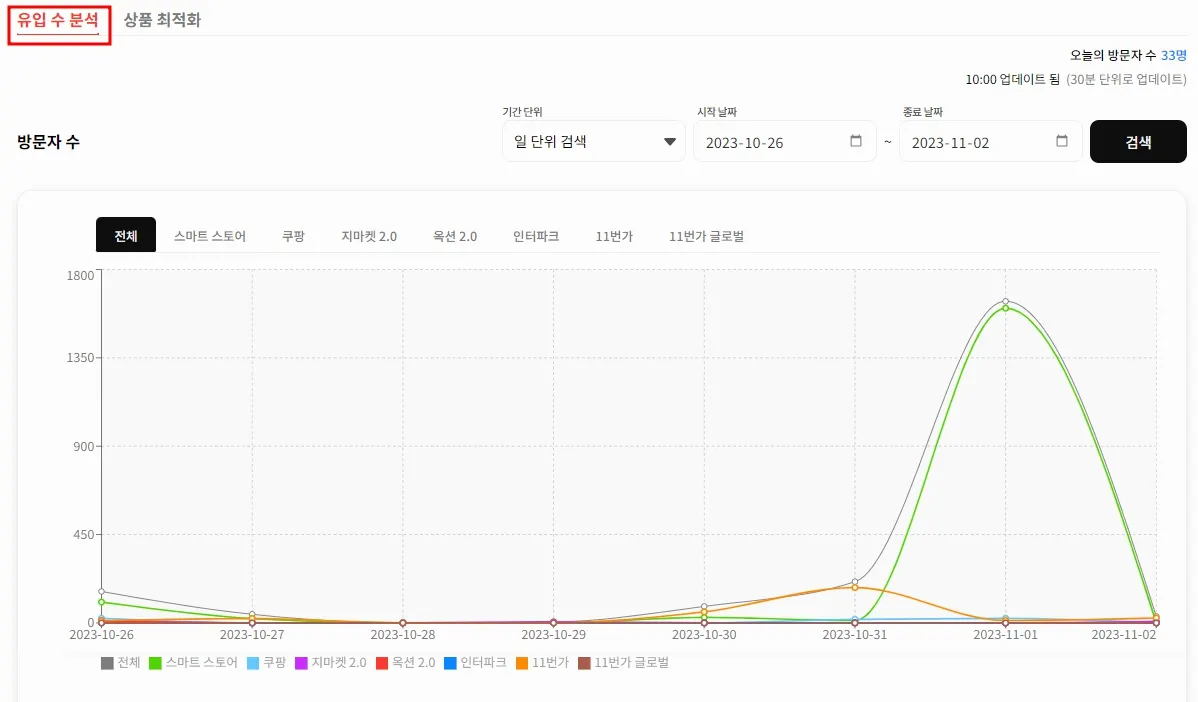 유입 수 분석 클릭하시면 기간별 조회 및 그래프 형식으로 상품 유입 수 확인이 가능합니다.