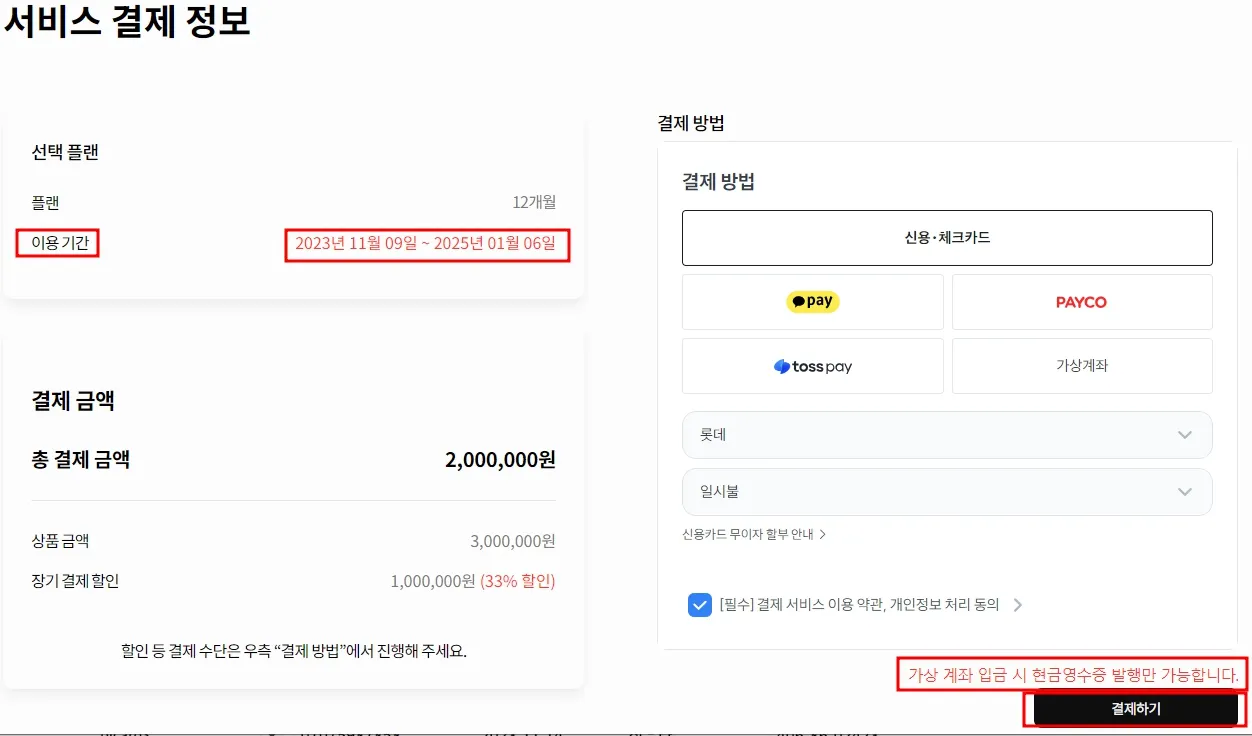 결제하기 버튼 클릭 후 부여되는 이용기간 미리 확인하시고 결제 진행해주시면 됩니다.