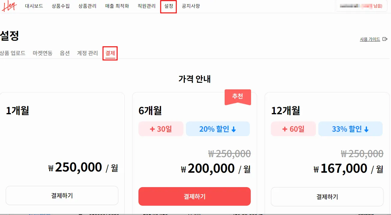 헤이셀러 설정→결제 탭 클릭하면 1개월 /6개월 /12개월 요금표가 있으며