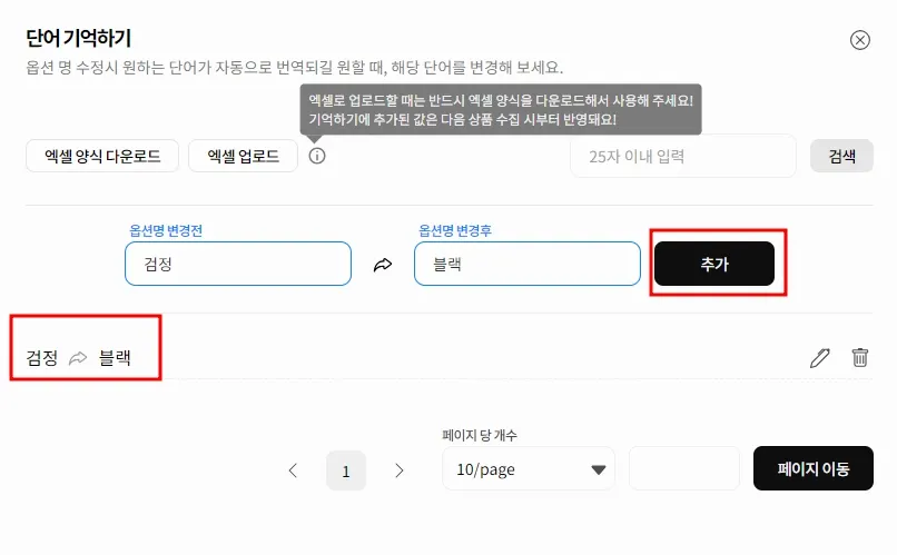 예를 들어 ‘검정→블랙’으로 적용 원할경우엔 단어를 입력 후 추가를 눌러주시면